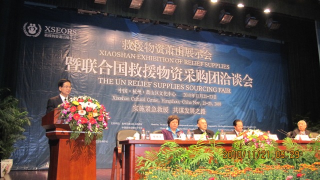 許岳榮首先代表區委區政府向來自聯合國、國家部委辦及其他到場的嘉賓表示熱烈歡迎。許岳榮指出,此次聯合國救援物資展示會和洽談會在蕭召開,標志著我區與聯合國計劃開發署進行實質性合作的第一步。希望通過此次活動,能更好地展示蕭山救援物資的生產能力,使廣大市民更加關注聯合國的救援賑災活動,促進和提高我區對外開放和開展國際合作的工作水平。我公司作為本區最具實力的醫療器械生產企業,希望通過本次緊急救援物資企業實力的集中展示,為聯合國緊急救援物資的緊急采購,為實現聯合國千年目標,建設和諧國際社會做出我們應有的貢獻。